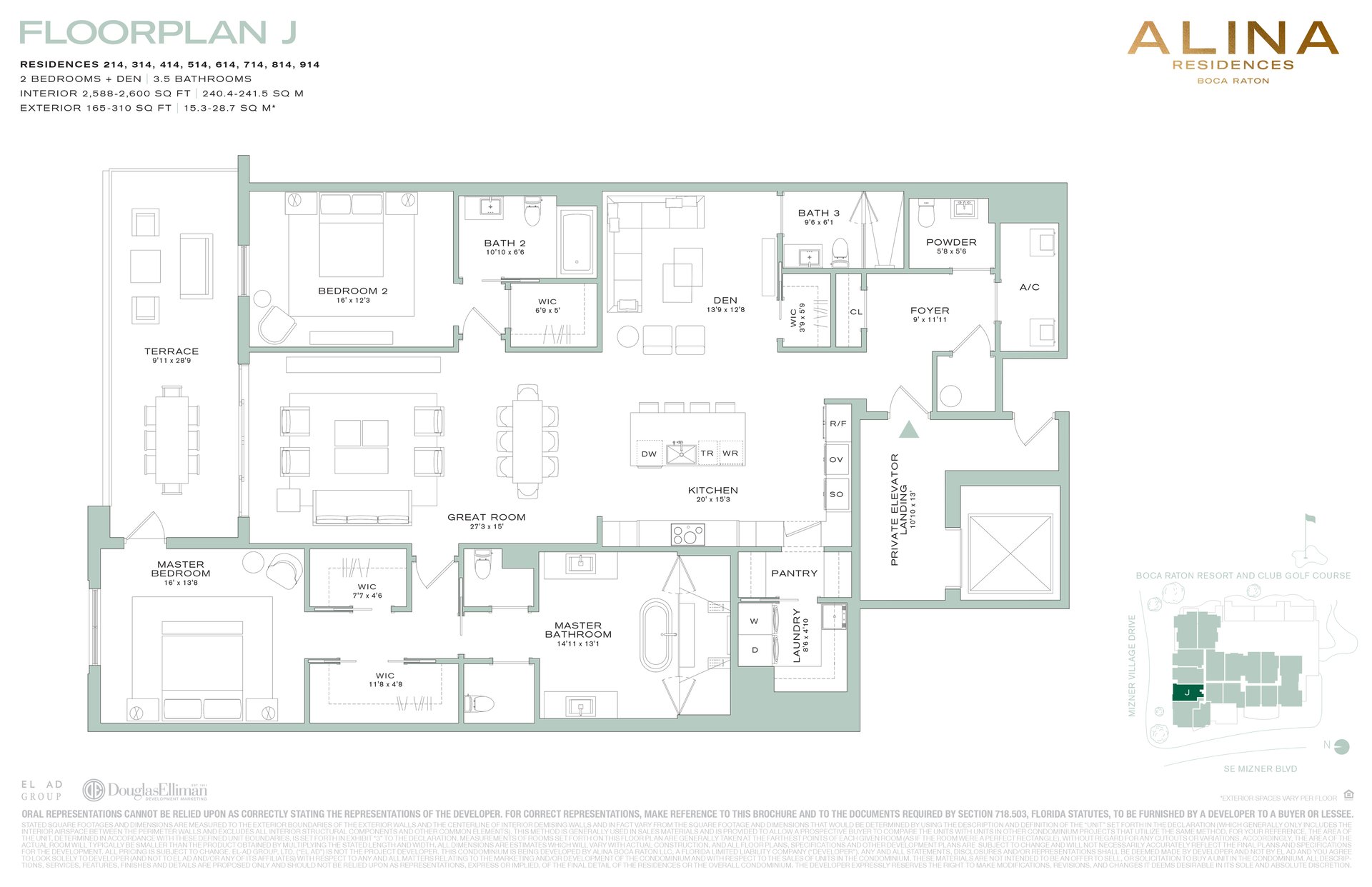 Experience the epitome of luxury living at ALINA Residences in the heart of downtown Boca Raton. This highly sought-after 5th-floor residence showcases sweeping garden, city, and golf course views from an expansive northeast-facing private terrace. Designed for both elegance and comfort, the residence features 2 bedrooms plus a versatile den, 3.5 bathrooms, and private elevator access directly into your foyer. Floor-to-ceiling windows and sliding glass doors fill the space with natural light, highlighting refined finishes such as Italian porcelain flooring, Porcelanosa fixtures, automated blinds, and custom Italkraft closets. The chef's kitchen is outfitted with top-of-the-line Miele appliances, including an induction cooktop and wine refrigerator.